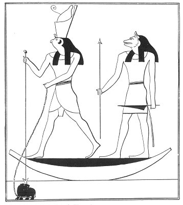 called Per-Rerehu, which derived its name from the "Two Combatants," or "Two Men," Horus and Set. A great fight took place, the enemies of Ra were defeated with great slaughter, and Horus dragged 381 prisoners on to the Boat of Ra, where he slew them, and gave their bodies to his followers.
