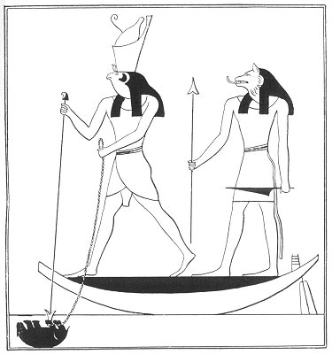 After these things Horus, son of Ra, and Horus, son of Isis, each took the form of a mighty man, with the face and body of a hawk, and each wore the Red and White Crowns, and each carried a spear and chain. In these forms the two gods slew the remnant of the enemies. Now by some means or other Set came to life again, and he took the form of a mighty hissing or "roaring" serpent, and hid himself in the ground, in a place which was ever after called the "place of the roarer." In front of his hiding-place Horus, son of Isis, stationed himself in the form of a hawk-headed staff to prevent him from coming out. In spite of this,