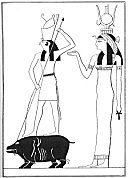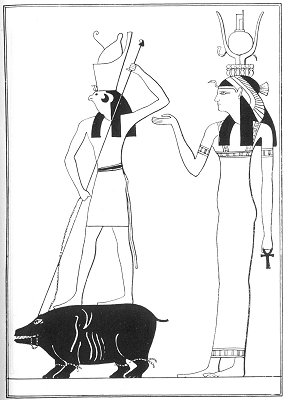 Horus driving his spear into the Hippopotamus-fiend; behind him stands one of his "Blacksmiths".