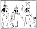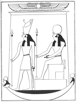 Right: Horus of Behutet, accompanied by Ra-Harmakhis and Menu, spearing the Hippopotamus-fiend.