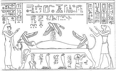 read: 1 "Thy two sisters, Isis and Nephthys, came to thee, Kam-urt, in thy name of Kam-ur, Uatchet-urt, in thy name of Uatch-ur" . . . . . . . "Isis and Nephthys weave magical protection for thee in the city of Saut, for thee their lord, in thy name of 'Lord of Saut,' for their god, in thy name of 'God.' They praise thee; go not thou far from them in thy name of 'Tua.' They present offerings to thee; be not wroth in thy name of 'Tchentru.' Thy sister Isis cometh to thee rejoicing in her love for thee. 2 Thou hast union with her, thy seed entereth her. She conceiveth in the form of the star Septet (Sothis). Horus-Sept issueth from thee in the form of Horus, dweller in the star Septet. Thou makest a spirit to be in him in his name 'Spirit dwelling in the god Tchentru.' He avengeth thee in his name of 'Horus, the son who avenged his father.' Hail, Osiris, Keb hath brought to thee Horus, he hath avenged thee, he hath brought to thee the hearts of the gods, Horus hath given thee his Eye, thou hast taken possession of the Urert Crown thereby at the head of the gods. Horus hath presented to thee thy members, he hath collected them completely, there is no disorder in thee. Thoth hath seized thy enemy and hath slain him and those who were with him." The above words are addressed to dead kings in the Pyramid