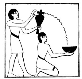 The Sem priest pouring water from a libation vase into a libation bowl held by a ministrant.
