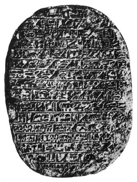 is here referred to, similar to that in the old story where the king marries a shepherdess for love. What Ti's religious views were, or what gods she worshipped, we have no means of knowing, but the inscription which is found repeated on several large steatite scarabs suggests that she favoured the cult of Aten, and that in the later years of her life she was a zealous and devoted follower of that god. To please her Amenhetep caused a great lake to be made on her estate called Tcharukha in Western Thebes. This lake was about 1 1/8 mile (3,700 cubits) long and more than 5/8th of a mile (700 cubits) wide, and its modem representative is probably Birkat Habu. On the sixteenth day of the third month of the season Akhet (October), in the 11th year of his reign, His Majesty sailed over the lake in the barge called ATHEN-TEHEN i.e. "Aten sparkles." And in following years this day was celebrated as a festival. Both lake and barge were made to give the Queen pleasure, and the fact that the name of Aten formed part of the name of the latter, instead of Amen, has been taken to show that both the King and Queen wished to pay honour to this solar god. In fact, it was definitely stated by Maspero that this water procession of the King marked the inauguration of the cult of Aten at Thebes, and he is probably correct.