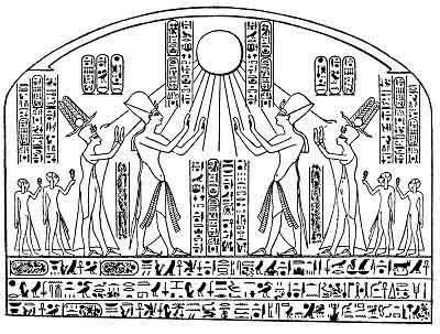 Aten, the great god, lord of heaven, from whom proceeds "life"; beneath is Amenhetep IV who is here represented conventionally as a Pharaoh.