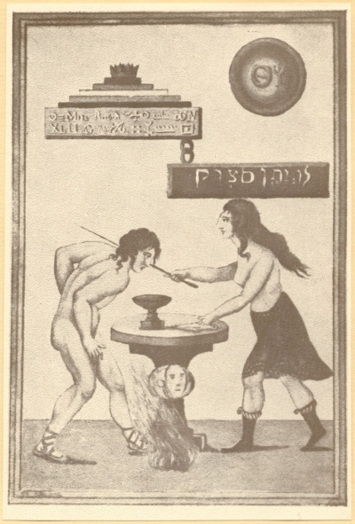 was a square mass; on its center shone a crystal star. On the north side was a painting representing a woman naked to the waist; a black drapery fell over her knees and two silver bands adorned her garment. In her hand was a rod which she placed against the forehead of a man facing her across a table which stood on a single support and bore a cup and a lance-head. A sudden flame rose from the ground and seemed to turn toward the man. An inscription explained this picture; another indicated the means I was to employ in order to leave this chamber. After having contemplated the picture and the star I was about to pass through the red door when, turning on its hinges with terrific noise, it closed before me. I made the same attempt with the door of sky-blue colour; it did not close but a sudden noise induced me to turn my head. I saw the star flicker, rise from its place, revolve, then dart rapidly through the opening of the white door. I followed it at once.