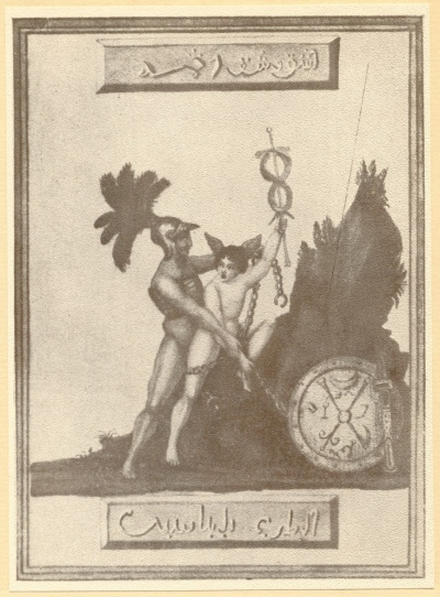 engourdies. Il sagittoit encore, essayait de fuir, mais si foiblement que je latteignis avec la plus grande facilité. Je le saisis, et lui passant un clou dacier a travers les ailes je lattachai sur le plancher de la tour. à laide dun marteau appellé à peine avois-je fini que loiseau reprit de nouvelles forces, il ne sagitta plus, mais ses yeux devinrent brillants comme des topazes jétois occupé à lexaminer quand un grouppe placé au centre de la salle attira mon attention, il représentoit un bel homme dans la fleur de rage il tenoit à la main une verge quentouraient deux serpens entrelacés, et sefforçait de séchapper des mains dun autre homme grand et vigoureux, armé dune ceinture et dun casque de fer sur le quel flottoit une aigrette rouge; une épée étoit près de lui elle etoit appuyée sur un bouclier chargé dhieroglyphes; lhomme armé tenoit dans ses mains une forte chaine il en lioit les pieds et le corps de ladolescent qui cherchoit vainement à fuir son terrible adversaire; deux tables rouges renfermaient des caracteres. Je quittai, la tour et ouvrant une porte qui se trouvoit entre deux pillers je me trouvai dans une vaste salle.