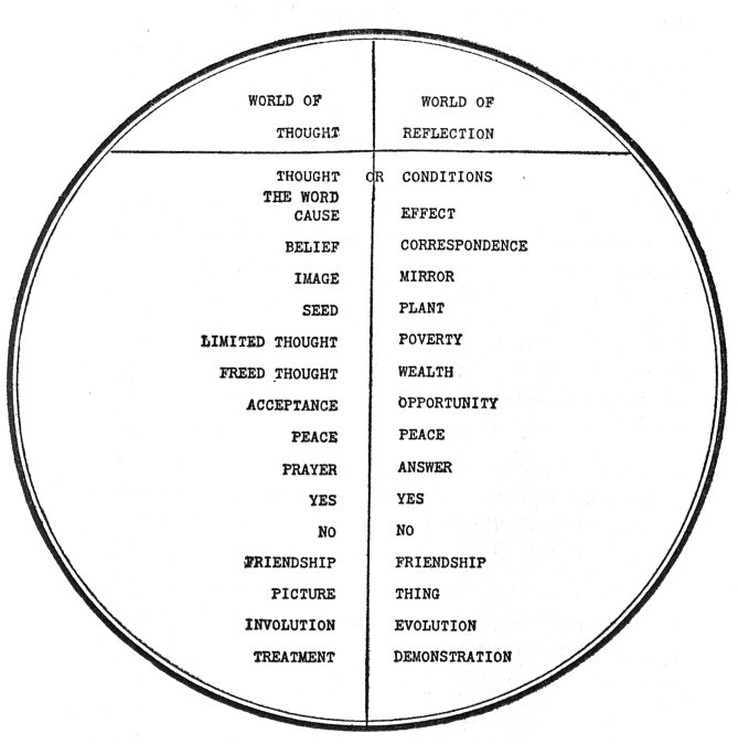 In turning to the Law, then, realize that It is a Law of reflection. "Life is the mirror of king and slave." Chart No. IV is divided into two parts with a suppositional line in the center; on one side is depicted the world of thought and on the other, the world of the reflections of thought. The world of thought is the world of our individuality; it is the part of us that knows. The other is the world of soul or receptivity and of reflections. In the thought is the cause that reflects the effect; the belief that reflects the correspondence. Here is the image; and here is a form. Here is the limited thought, the result of which reflects poverty. Here is the freed thought, the result of which reflects wealth. Here is a thought of peace which reflects peace. Here is a prayer and here is its answer; the answer to prayer is in the prayer when it is prayed, and the answer is identical with the prayer. Here is Yes and here is Yes; and here is No and here is No. Why is this? Because the Law takes us at our own valuation; if we say "Yes," It says "Yes"; and if we say "No," It says "No"; for It can only reflect; It cannot initiate anything. So here is friendship and over here is friendship. Emerson said: "If you want a friend, be a friend"; and so, as the idea of friendship dawns upon the consciousness, the law of attraction produces friends; for one is the picture and the other is the thing. This is the great teaching of Involution and Evolution, the thought involved and the result evolved; one is the treatment and the other is the demonstration.