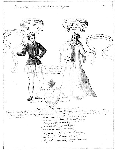 Leaf 1. The top line reads: "Our earliest medicine was made of natural objects." About the king and queen appears the statement that to them a son shall be born "in two trees of the vine," resembling his father and without equal in all the world. About the vase is written: "Green and white." "The vase flame color, the flowers green." "Our water, our silver." The lines below read: "The material of the Philosopher's Stone is that thick, viscous water, which either heat or cold congeals. It is Mercury boiled down and thickened, cooked in neutral earth with sulphurous heat and is called the Prime Material of the metals. In caverns yet dark, and forbidding mountains, if a Stone be found which a thousand years ago Nature made out of her fruits, it will bring him that has it out of trouble. * * * Listen carefully to all my verses; I speak them without veil and without deception.