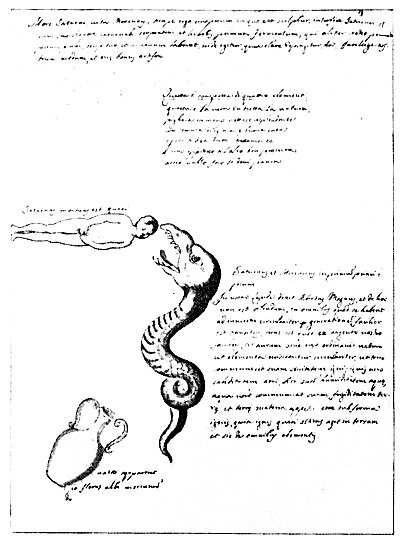 Leaf 3. The writing at the top of the page reads: "Death of Saturn; life of Mercury." After describing the use of the saturnine substances, the key to the process is declared to be depicted below. The verse reads "This [the stone] is made of four elements. This is the truth in all Nature. Take it in hand, bright and shining, with all diligence and great care and then try to bind all securely together side by side, so the fire may cause alarm." Above the human figure is written: "Saturn is almost dead." To the right if the devouring serpent is a statement of Albertus Magnus that Saturn and Mercury are the first principles of the Stone. It also declares that Nature wisely provided a mixture of elements so that earth can communicate its dryness to fire, fire its heat to air, air its moisture to water, and water its coldness to earth. (Text about the vase is illegible in original.)