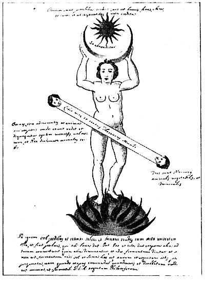 Leaf 4. At the top: "Let them believe that . everything is possible. The art is fleeting, bright and rare, and not believed by the foolish." The words between the sun and crescent read "It is hidden," and on the panel across the body "The Book of life and true Treasury of the World." The panel to the left of the figure says "Moving almost all, and the soul of its body returns to the place from which it had fled, and ripens seven months or nine, and the King crowned with his diadem appears." The right panel states: "There are three Mercuries: animal, vegetable, and mineral." The text below is of such a cryptic nature that to translate it is well nigh impossible. It declares that by putting fire beneath the feet of the symbolic figure it is possible to extract therefrom the sun and the moon which the human body is shown elevating to a position of dignity above its head.