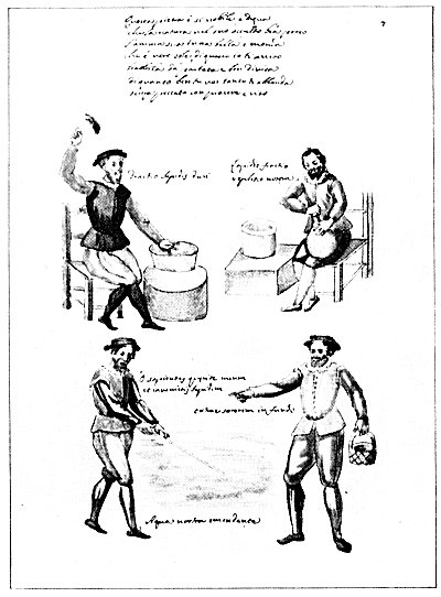 Leaf 7. The verse at the top reads:," This Stone is so noble and worthy that Nature has hidden it in her recesses. Its soul is all fair, and pure, for it is the true sun. I inform you of this. Keep it removed, apart and separated. Whatever boon you crave, it will come to you bounteously. without sin, with pleasure and delight." The seated figure on the left holding aloft the hammer is described as breaking hard stone, while the words beside the man with the retort read: "Breaking of stone our replenishment." Between the standing figures below is the exclamation; "O Sages, seek and ye shall find my Stone!" Under the outstretched hand of the man with a basket appear the words: "Draw out sorerem [?] in the bottom." Below the pool which the man on the left is stirring appears the simple statement: "Our healing water." The faces of the four men are extremely well drawn.