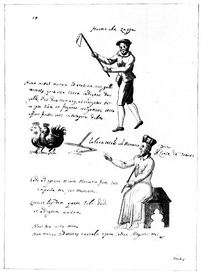 Leaf 14. The three words at the top of the left page are translated: "The man that digs." Above the birds it is declared that none but the cocks of Hermes, the two Mercuries, shall put hand to the plow, and only after irrigation will the earth bring forth her fruits. The seated man is Count Bernard of Treviso, who says: "Work the earth with Mercury." (See chapter on Alchemy and Its Exponents.) The three sentences to the Count's left read: "Go to the fire and with Mercury, thy brother, await me for a month. Crumble the stone I gave thee and I shall go to the fire. Thy death, my life. I shall net die but, living, tell of the works of this, my master." Bernard of Treviso in his alchemical speculation emphasized the necessity of meditation upon the philosophical writings of the great adepts rather than chemical experimentation. He ultimately discovered the "Stone."