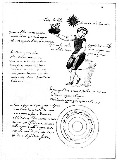 Leaf 15. The first sentence reads: "The fruit of plants by virtue of the Sun, our Stone." The boy holding the dish is made to say: "Drink here all ye that are athirst. Come unto me, run to the waters. Here drink, without price, and drink your fill. Open your eyes and see the wonders of the earth. They learn, my thirsty twenty and four." Beneath the boy are the words: "In the beginning God created the Heavens and the Earth, and divided the waters from the waters. Bless the waters which are above the Heavens." The circle contains this statement: "The earth without form and void. Out of the stars come the rains." The lower left panel continues the alchemical process, ending with admonition to renounce the misery of worldly existence. Above is a prayer to the Virgin Mary which opens thus: "Hail Mary, full of grace, the Lord be with thee. Blessed thou among women."