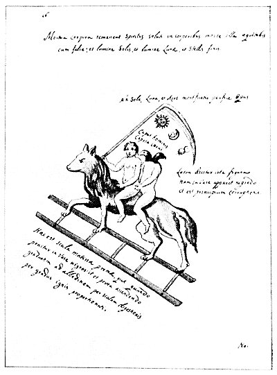 Leaf 16. The first sentence reads: "The dead bodies remain; the spirits are freed by the death in the bodies. You will ride with that death with a scythe, and the light of the Sun, the Moon, and the fixed stars." Over the scythe is written: "Subject to the Sun, the Moon and Azoth, complete the Work." The four words in the curve of the scythe blade say: "Man's head, head of raven." The three lines to the right are interpreted thus: "This figure is called Laton, for it looks black in a vessel, and is the beginning of corruption." The text below the ladder states: "This is the ladder of primitive matter which when placed in a vessel turns black, the gradually changes to white by the scale [ladder] of digestion, according to the degree of heat." Here a ladder is used to signify the natural steps up which matter must ascend before it can attain to a truly spiritual state.