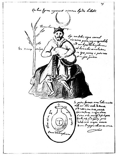 Leaf 19. At the top it reads: "He that comes to know this figure will have knowledge of the Stone." The seated man probably represents Paracelsus. To his right are the words: "I am neither tree nor animal, nor stone nor vegetable, but the Philosopher's Stone, trampled on by men, cast into the fire by my father, and in fire I rejoice." The four words to the left say "In dryness is the Stone." Below the man is the Philosophic Egg containing the words: "It is the end in which the beginning rests." The capital T stands for "Tincture." The text to the right states: "In Stone it is formed, as Gerber writes in his book very learnedly, and possessing so much of its nature that it changes into clear, living water; and it has the power to make folks rich, satisfied, and free from all cares, so they will be always happy if they attain by their wit to the secret."