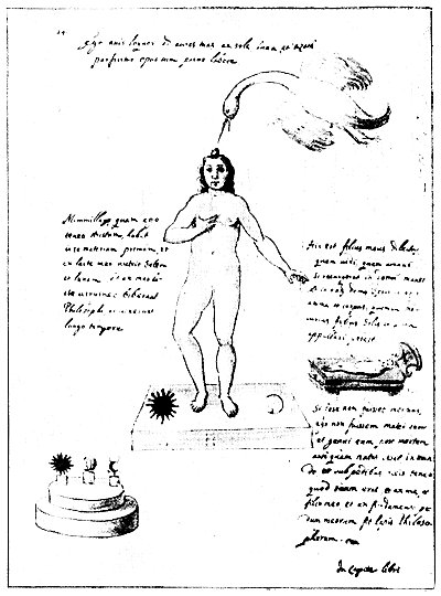In his dedication the author and illustrator of the manuscript declares that he has set forth all the operations of the Great Work. He prays to the Holy Spirit that he may be included in the number of those who have pursued this most noble of the sciences and that he may be set always in the path of righteousness. Exclusive of his own researches, the main sources of his information are said to be the writings of St. Thomas Aquinas, Raymond Lully, and Arnold of Villa Nova.