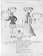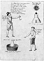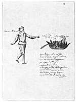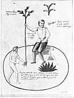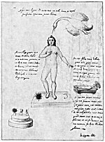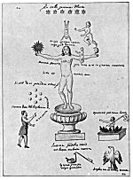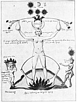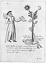 Leaf 18. At the left holding a book stands Aristotle, who is described as the most learned of all the Greeks. The tree surmounted by the Sun and Mon. is accompanied by the wards: "When the Stone is dead, that is changed to water, in this it will produce flowers." Beneath Aristotle and the prostrate human figure from which rises the flowering tree are these statements: "He who makes everything descend from heaven to earth, and then ascend from earth to heaven, has information about the Stone. For in Mercury there is something the wise seek, not invoked except by white or red ferment." The first part of this quotation is based upon the Emerald Tablet of Hermes (which see). In ordinary man, the spirit is figuratively absorbed by the body; but in the true philosopher, the spirit is so greatly increased in power that it absorbs into itself and is nourished by man's corporeal body.