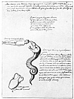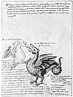 Leaf 5. In the upper panel it is declared that the sun-bird battles with the earth-serpent, who, tearing out his own entrails, gives them to the bird. The spirit is vivified and Lazarus with joy is raised from the dead. Above the bird is written: "This is the sun in the form of a bird," and above the dragon "This is the dragon devouring the bird. The first operation." The panel of text at the lower left reads in substance: "When our sperm (quicksilver) is mixed with the mother of elements (earth), the action is called coitus. The detention by the earth of a bit of quicksilver is called conception. The earth grows and multiplies and the operation is called impregnation. When earth is whitened with water and made of uniform color and appearance, it is called birth and the King is born out of fire." The text at lower right was deliberately mutilated to conceal a too evident secret.