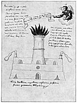 Leaf 22. The verse in the upper left is as follows: "This group is composed of three stones: lunar, solar, and mercurial. In the lunar is white sulphur; in the solar, red sulphur, in the mercurial, both; i.e. white and red, and this is the strength of all instruction." In the bottle at the left are the words: "Dissolving, calcination, sublimation complete the instruction"; and at the base: "Wash, congeal, and coagulate. " Under the central tower is written: "Metallic salts, however, are hidden by one letter"; around the bottom of the red circle: "Dryness, coldness, humidity, heat, and dryness." On the points below are the names of the four elements. The initial, I A A T appear four times with the same meaning as that already given. The three powers of the Philosopher's Stone are symbolized by the heads of the cherubs in the circle in the upper left corner.