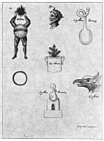 Leaf 26. This page, which concludes that part of the Hermetic manuscript bearing the symbols of the Secret Work, contains a number of emblems not directly correlated. At the top is the head of the King--the most common of alchemical figures. To the right of the King is an alchemical vessel designated the Hermetic Seal. Below is the head of a ferocious bird, here designated a griffon. To the left of the King is a headless figure elevating a Sun, or spiritual face. This figure is the world, which must be headless, since its spiritual and rational part is not material and consequently, is invisible. Below is a circle unaccompanied by descriptive matter. Directly under the King's head is a vase of flowers, in which rises the golden plant of the Philosophers. At the bottom of the page is additional alchemical equipment, this also being termed a Hermetic Seal.