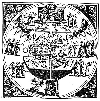 The first circle portrays the divine antecedents of justice, the second the universal scope of justice, and the third the results of human application of justice. Hence, the first circle deals with divine principles, the second circle with mundane affairs, and the third circle with man. On the at the top of the picture sits Themis, the presiding spirit of law, and at her feet three other queens--Juno, Minerva, and Venus--their robes ornamented with geometric figures. The axis of law connects the throne, of divine justice above with the throne of human judgment at the bottom of the picture. Upon the latter throne is seated a queen with a scepter in her hand, before whom stands the winged goddess Nemesis--the angel of judgment.