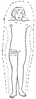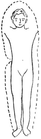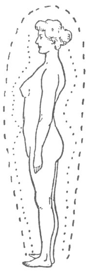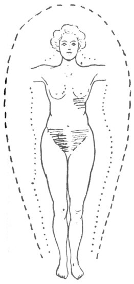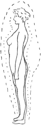 When inspected, the outer aura reached the healthy standard of distinctness. The shape was good with the exception of a wide dorsal bow, which commenced at the head and finished at the feet. The breadth was nine and a half inches round the head and by the sides of the trunk. It was six by the thighs and four and a half by the ankles. Down the front it was four and a half, while at the widest part of the bow at the back it measured nine inches. The inner aura was not quite as plain as the average, but exhibited striation all over the body. On the left side, at the front and at the back it was three inches throughout. On the right side above the level of the umbilicus, and
