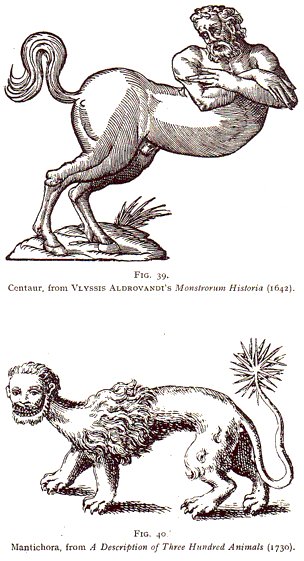 animals of the Bestiaries, such as the basilisk, centaur, dragon, griffin, hydra, mantichora, unicorn, phoenix, etc. The centaur (fig. 39) was a beast, half man, half horse. It typified the flesh or carnal mind of man, and the legend of the perpetual war between the centaur and a certain tribe of simple savages who were said to live in trees in India, symbolised the combat between the flesh and the spirit.[1]