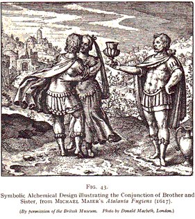 and dry, and thou, the Moon, are cold and moist; when we are wedded together in a closed chamber, I will gently steal away thy soul.' . . . Rosinus: 'When the Sun, my brother, for the love of me (silver) pours his sperm (i.e. his solar fatness) into the chamber (i.e. my Lunar body), namely, when we become one in a strong and complete complexion and union, the child of our wedded love will be born.' . . . 'Rosary': 'The ferment of the Sun is the sperm of the man, the ferment of the Moon, the sperm of the woman. Of both we get a chaste union and a true generation.' . . . Aristotle: 'Take your beloved son, and wed him to his sister, his white sister, in equal marriage, and give them the cup of love, for it is a food which prompts to union.' "[1] KELLY, of course, accepts the traditional authorship of the works from which he quotes, though in many cases such authorship is doubtful, to say the least. The alchemical works ascribed to ARISTOTLE (384-322 B.C.), for instance, are beyond question forgeries. Indeed, the symbol of a union between brother and sister, here quoted, could hardly be held as acceptable to Greek thought, to which incest was the most abominable and unforgiveable sin. It seems likelier that it originated with the Egyptians, to whom such unions were tolerable in fact. The symbol is often met with in Latin alchemy. MICHAEL MAIER (1568-1622) also says: "conjunge fratrem cum sorore et propina illis poculum amoris," the words forming a motto to a picture of a man and woman clasped in each other's arms, to whom an older man offers a