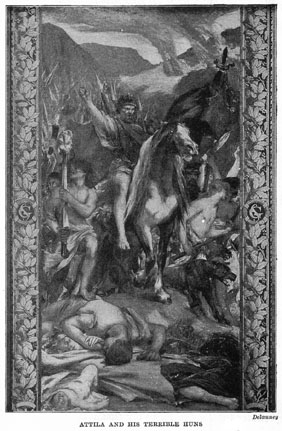 This made peace, but the peace did not last long. In a few years Attila appeared at the head of an army of 700,000 men. With this great force he marched across Germany and into Gaul. He rode on a beautiful black horse, and carried at his side the sword of Tiew. He attacked and destroyed towns and killed the inhabitants without mercy. The people had such dread of him that he was called the "Scourge of God" and the "Fear of the World."