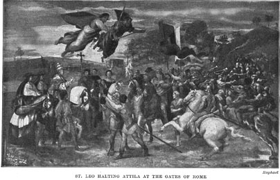 The people of Rome and the Emperor Valentinian were greatly alarmed at the approach of the dreaded Attila. He was now near the city, and they had no army strong enough to send against him. Rome would have been again destroyed if it had not been for Pope Leo I who went to the camp of Attila and persuaded him not to attack the city. It is said that the barbarian king was awed by the majestic aspect and priestly robes of Leo. It is also told that the apostles Peter and Paul appeared to Attila in his camp and threatened him with death if he should attack Rome. He did not go away, however, without getting a large sum of money as ransom.