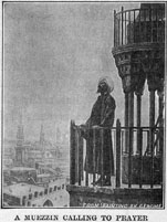 Good Mohammedans pray five times every day, and there is a church officer called a muezzin, who gives them notice of the hour for prayer. This he does by going on the platform, or balcony, of the minaret, or tower, of the mosque and chanting in a loud voice such words as these: