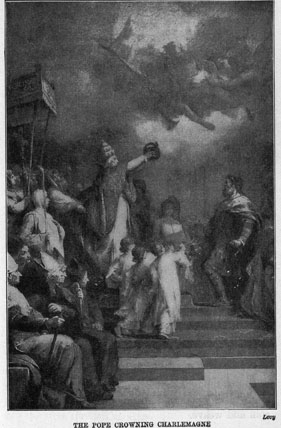 For more than forty years Charlemagne was king of the Franks; but a still greater dignity was to come to him. In the year 800 some of the people in Rome rebelled against the Pope, and Charlemagne went with an army to put down the rebellion. He entered the city with great pomp and soon conquered the rebels. On Christmas day he went to the church of St. Peter, and as he knelt before the altar the Pope placed a crown upon his head, saying: