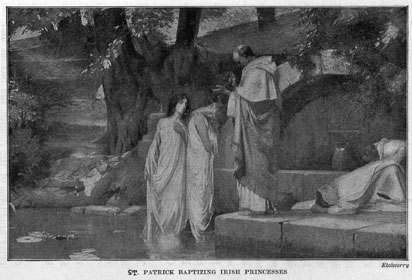 ARTHUR and his knights were devoted Christians. For the Romans had not only made good roads and built strong walls and forts in Britain, but they had also brought the Christian religion into the island. And at about the time of the Saxon invasion St. Patrick was founding churches and monasteries in Ireland, and was baptizing whole clans of the Irish at a time. It is said that he baptized 12,000 persons with his own hand. Missionaries were sent out by the Irish Church to convert the wild Picts of Scotland and at a later day the distant barbarians of Germany and Switzerland.