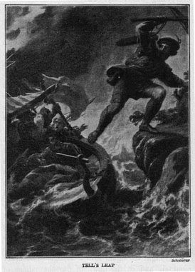 The story tells us that just at this time Gessler, the Austrian governor, who was a cruel tyrant, hung a cap on a high pole in the market-place in the village of Altorf, and forced everyone who passed to bow before it. Tell accompanied by his little son, happened to pass through the marketplace. He refused to bow before the cap and was arrested. Gessler offered to release him if he would shoot an apple from the head of his son. The governor hated Tell and made this offer hoping that the mountaineer's hand would tremble and that he would kill his own son. It is said that Tell shot the apple from his son's head but that Gessler still refused to release him. That night as Tell was being carried across the lake to prison a storm came up. In the midst of the storm he sprang from the boat to an over-hanging rock and made his escape. It is said that he killed the tyrant. Some people do not believe this story, but the Swiss do, and if you go to Lake Lucerne some day they will show you the very rock upon which Tell stepped when he sprang from the boat.
