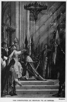 At last the English were driven far to the north of France. Then Charles, urged by Joan, went to Rheims with twelve thousand soldiers, and there, with splendid ceremonies, was crowned king. Joan holding her white banner, stood near Charles during the coronation.