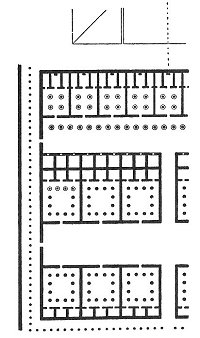 He suggests that the shrines which he found formed part of a series of nine, ranged along the foot of the pyramid, each attached to a columned court, the whole series of courts opening opposite a series of twenty-seven columns arranged down the length of a great hall running east and west; on the other side of this hall would be another series of columned courts, six in number and larger than the others, separated by another long hall from a further series of six (Fig. 4).