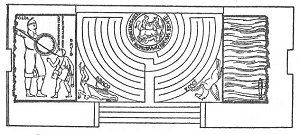 [paragraph continues] Honnecourt. In a ninth-century French manuscript, formerly belonging to the Abbey of St.-Germain-des-Prés, there is a sort of frontispiece consisting of a labyrinth of similar type, with a funny little horned Minotaur at the centre, seated, hands on knees, on a kind of throne.
