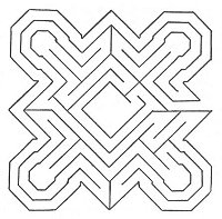 On the floor below the tower of the church at Bourn, Cambridgeshire, is a maze (Fig. 58) worked in black and red tiles, the centre being occupied by the font, the step of which forms the terminus of the path. From the fact that an intermediate portion of the path is concealed beneath the base of the font it is plain that the position of the latter is an after-thought, and from the design of the maze, no less than from the character of the tiles of which it is composed, the work would appear to be of comparatively modern date. The modern specimen at Ely has already been mentioned.
