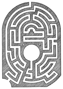 A figure of a maze accompanies this criticism, but it can hardly be meant to typify the usual conception of a hedge maze, as it has the appearance of a seventeenth-century design, possibly intended for a floral labyrinth, for, apart from a few ornamental excrescences, it is entirely unicursal.