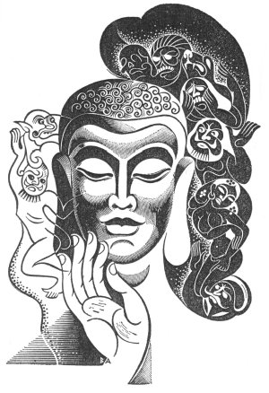 cunning though they were, had no effect: Gotama remained unmoved. He reflected that if his cousin were acting in such way it was because of a malice that possessed him, and if the nobles of the land permitted him to act unjustly it was because they were weak and cowardly. And then he thought upon weakness, malice, and cowardice, and he resolved to raise himself above them by destroying in himself the centre out of which they come; namely, desire that fixes itself upon things of this world. He resolved, too, to show others how to destroy that desire in themselves. So he remained unmoved. The spirit of the tree cast perfumes upon him, and prayed him through its leaves to continue his mighty efforts towards Enlightenment.