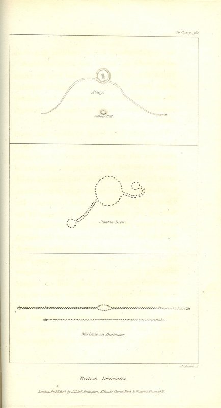 2. The most remarkable dracontium in England is that of ABURY in Wiltshire, about five miles west of Marlborough, on the Bath road; over which thousands of travellers pass without dreaming that the ground upon which they tread was once esteemed the most holy in Britain. Of the temple of Abury an invaluable account has been left by the learned and ingenious Dr. Stukeley, in a volume replete with deep research and interesting facts. Having perused this volume with the attention which it demands, the reader should next have recourse to the splendid work of Sir Richard Colt Hoare on "the History of Ancient Wiltshire," in which he will discover ABURY AS IT IS, in the ruins of its magnificence. The theory of Stukeley is here sanctioned by an indisputable authority,