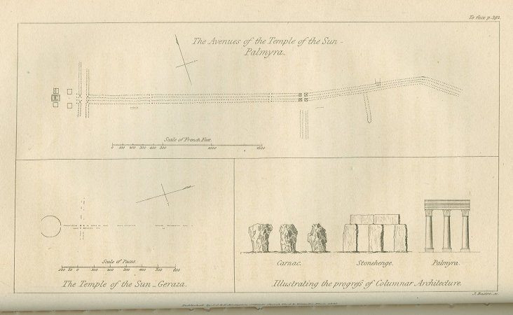 The temples of the sun at Palmyra and Geraza, both in the country formerly devoted to the worship of OUB, the serpent god of Canaan, are illustrations in point. An examination of their columns, which supported no roof will justify the inference that they were substituted for those of some ancient dracontia occupying the same sites. The avenues of Palmyra particularly illustrate this theory by their sinuous course, although sinuosity as we have before observed, is not indispensably necessary to a dracontium,