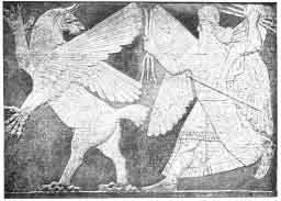 The struggle between Bell-Merodach and Tiamat was a favorite subject with Assyrian artists. In one of them,