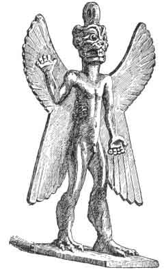 suspend the figure. On the back of the statue is the inscription in sumero-accadian, indicating that it represents the demon of the southwest wind and that it should be placed at the door or the window for the sake of warding off his injurious influence. The south-west