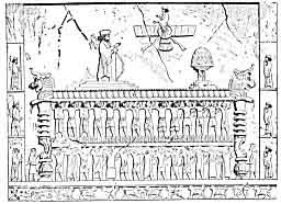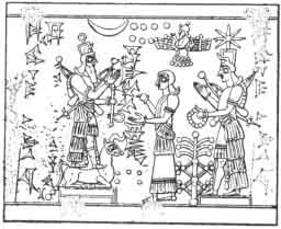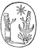 figure without wings, rising from a crescent that hovers above the sacrificial fire. Above him is a picture of the sun, and before him stands a priest or a king in an attitude of adoration.