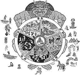 A TIBETAN WHEEL OF LIFE. (Reproduced from Bastian.)