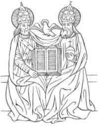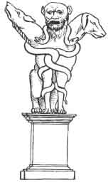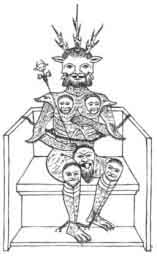The Trinity conception of Satan is as old as the Trinity conception of God. As we have Trinities among the Pagan deities, for instance among the Greeks, the three-headed Hecuba; so we have three-headed monsters as for instance, the three-headed Cerberus; and in the history of Christian art a similar parallelism obtains between God-representations arid Devil -representations. The idea of representing the divine trinity as a person having three faces may have originated in a modification of the two-headed Janus.