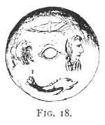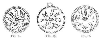 [paragraph continues] 3 (Fig. 14), and is a struck medal having in the centre the eye, surrounded by a crocodile, swan, serpent, cock, dog, lion, winged phallus, scorpion, and thunderbolt.