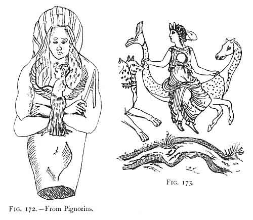 with wings (Fig. 170) as a flying goddess. This is a step forward; but Wilkinson, vol. iii. p. 115, shows us precisely what we are looking for (Fig. 171). This is the goddess Hathor, holding precisely the same relation to Isis as the Ephesian Artemis held to the chaste Roman Diana; or rather we may say that Hathor was to Isis what Proserpine was to Diana. 593