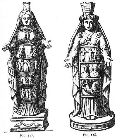 Such a chain of evidence, connecting in the most obvious manner the beliefs of to-day with the mythology of perhaps thirty centuries ago, is not often to be found; and again, judging from the known to the unknown, it is reasonable to maintain that most of the habits and customs now persistently upheld by the people would, if they could be thus traced, be found to have their beginnings in the same dim ages of obscure antiquity. Conversely, there is hardly a custom or occult practice of the ancients which may not be traced somewhere or somehow amongst their modern descendants. The statuette (Fig. 175), well known to the writer, is now in the Museum of the Collegio Romano. The others are in private collections. It is strange that not one of these four seems to have been known to Montfaucon, or to his authorities. He has, however, the more typical statue of the Ephesian goddess (Fig. 69), in which she appears as the patroness of maternity. Those which have the attribute of Proserpine so prominent, appeal more to the Roman ideal, although they are matronly in appearance.